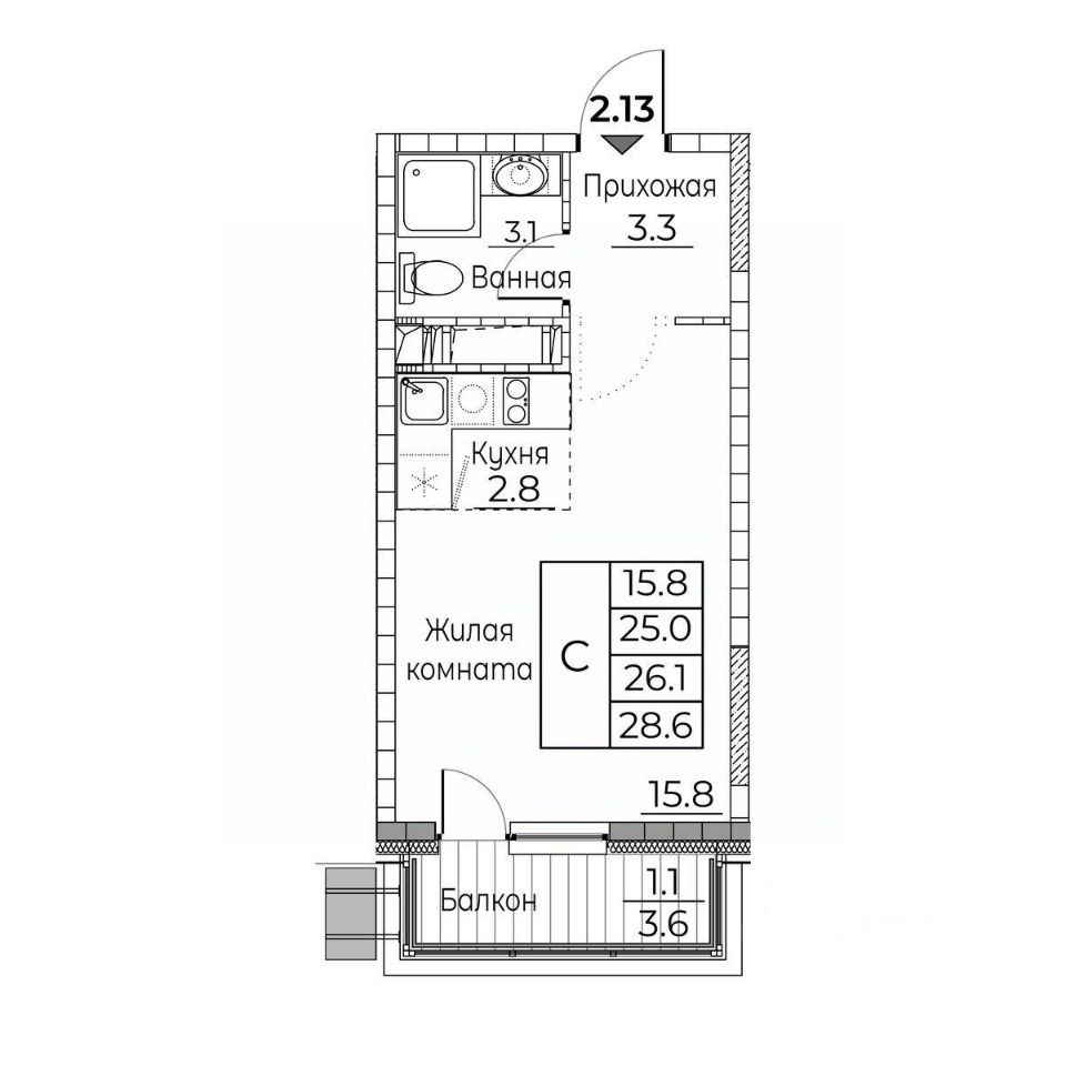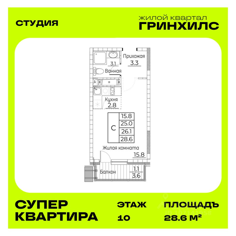 Общая площадь квартиры — 28.6 кв. м, этаж 10 из 23.