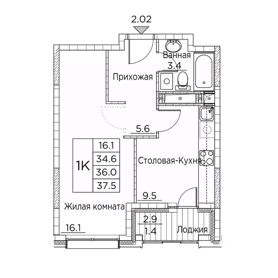 Общая площадь37,5 м²