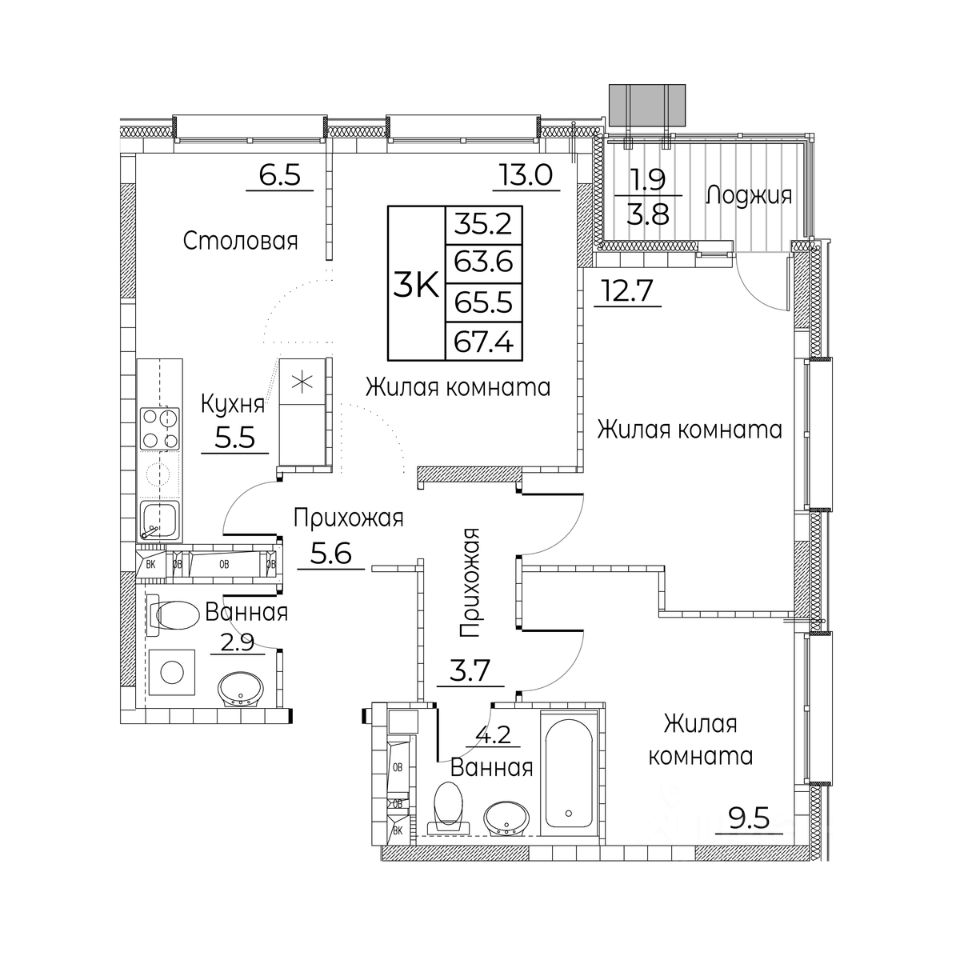 Общая площадь квартиры — 67.4 кв. м, этаж 17 из 23.