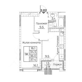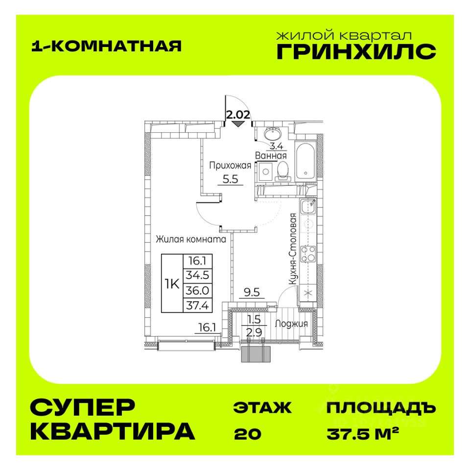 Общая площадь квартиры — 37.5 кв. м, этаж 20 из 23.