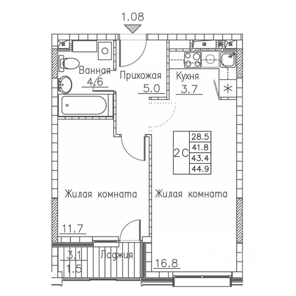 Общая площадь44,9 м²