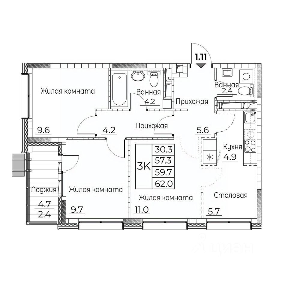 Общая площадь квартиры — 62 кв. м, этаж 4 из 18.