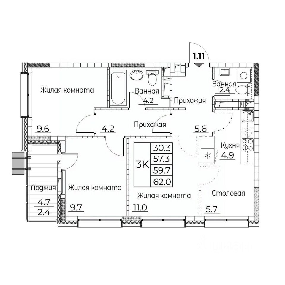 Общая площадь квартиры — 62 кв. м, этаж 5 из 18.