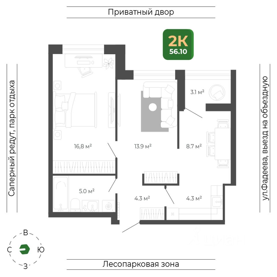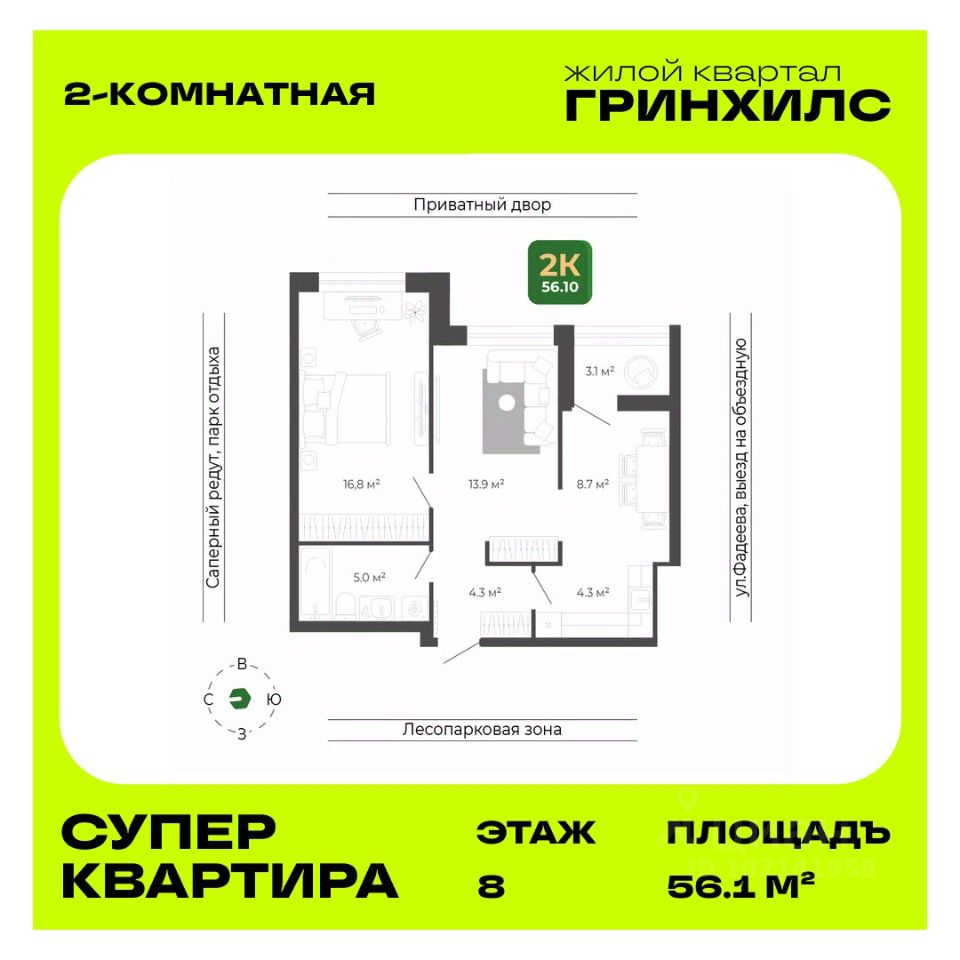 Общая площадь квартиры — 56.1 кв. м, этаж 8 из 18.