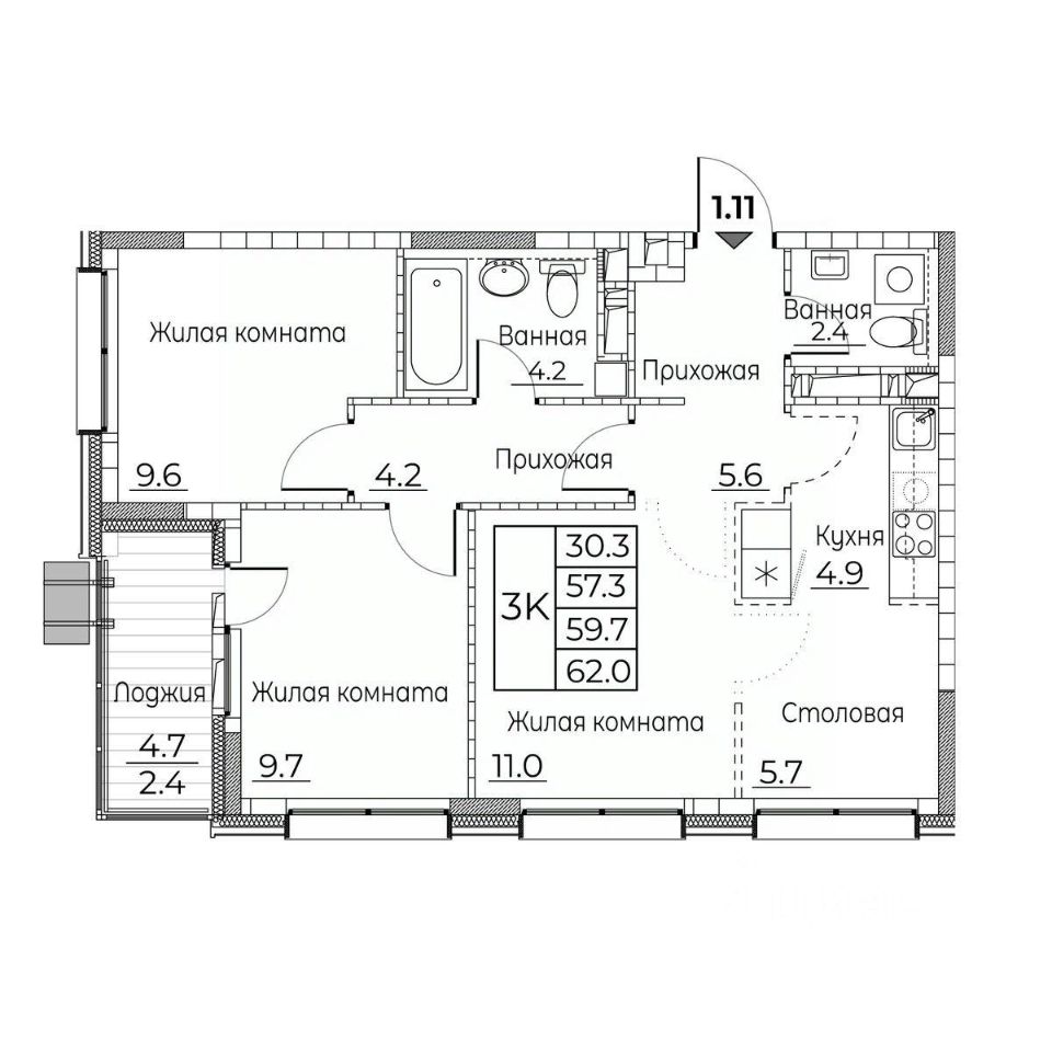 Общая площадь квартиры — 62 кв. м, этаж 13 из 18.
