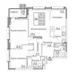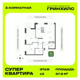 Общая площадь квартиры — 67.8 кв. м, этаж 13 из 18.