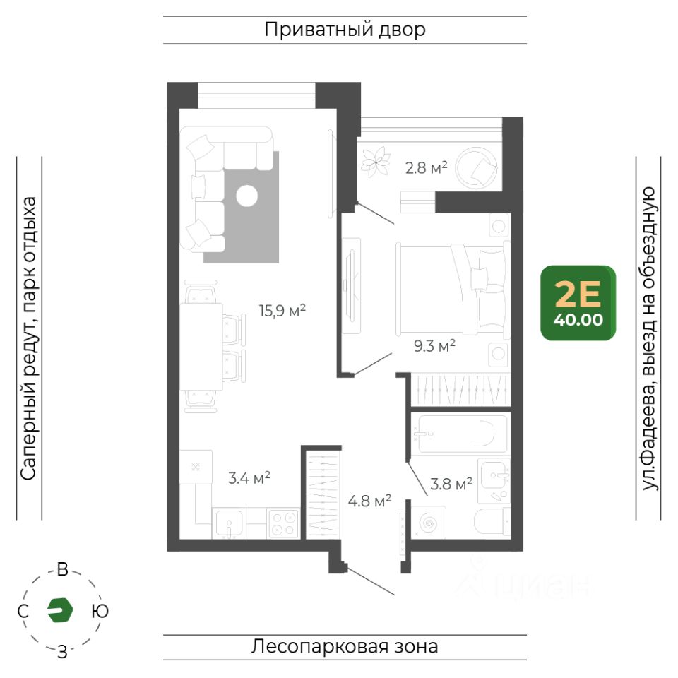 Общая площадь квартиры — 40 кв. м, этаж 15 из 18.