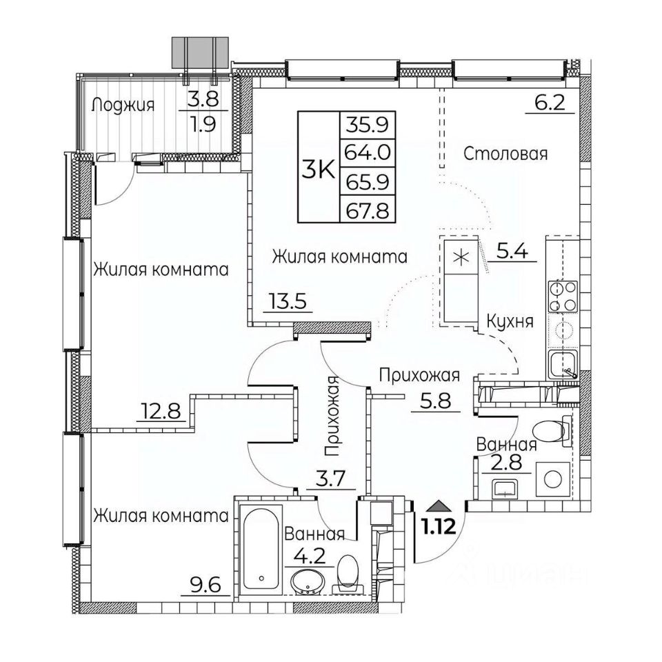 Общая площадь квартиры — 67.8 кв. м, этаж 16 из 18.