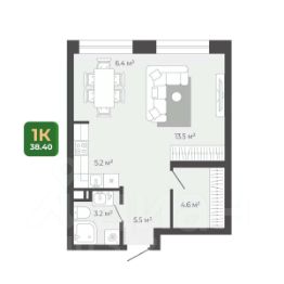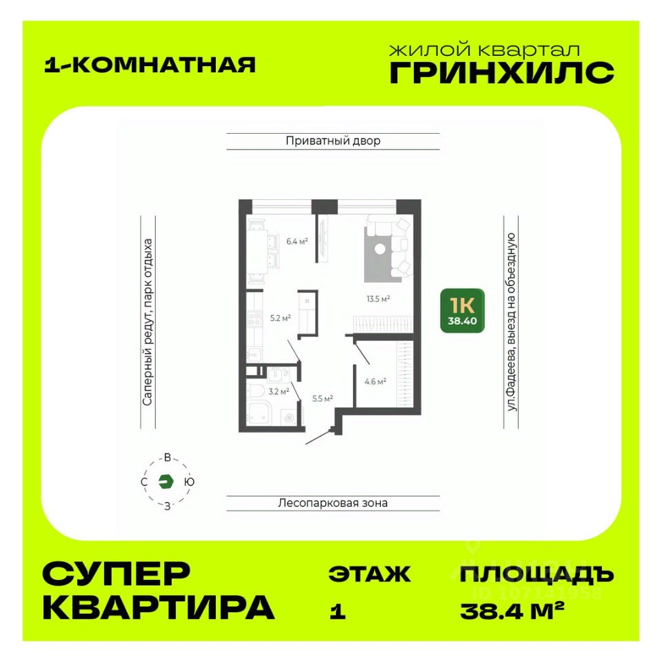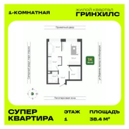 Общая площадь квартиры — 38.4 кв. м, этаж 1 из 19.