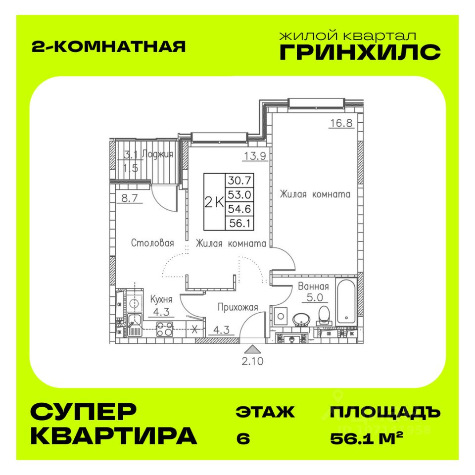 Общая площадь квартиры — 56.1 кв. м, этаж 6 из 19.