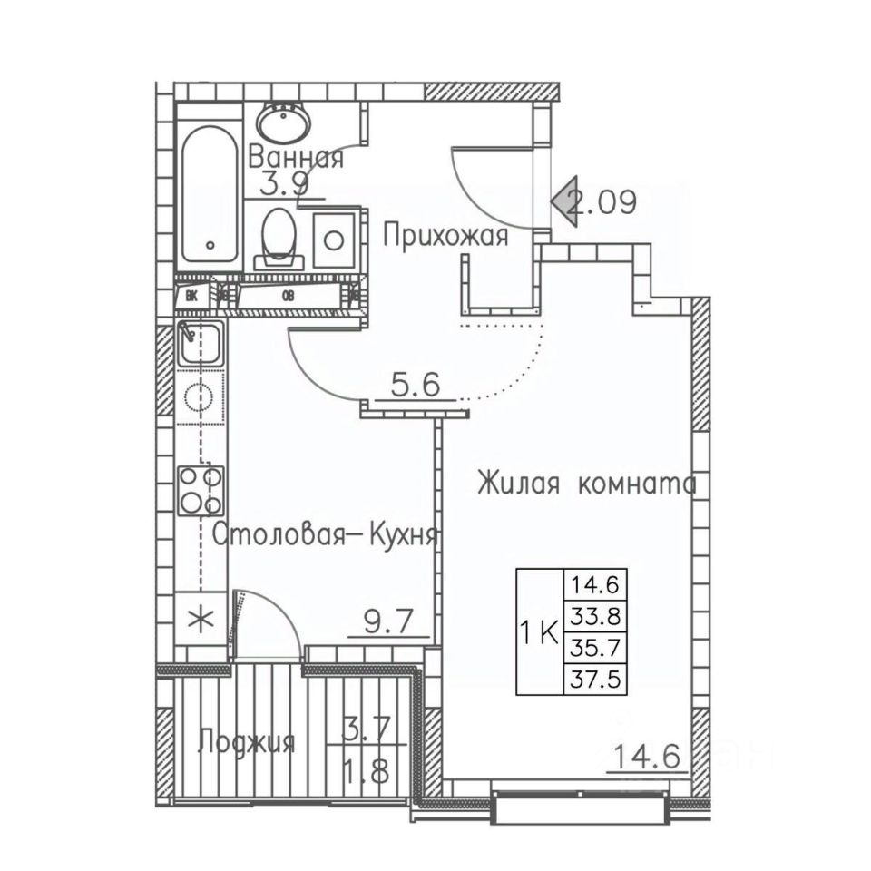Общая площадь37,5 м²