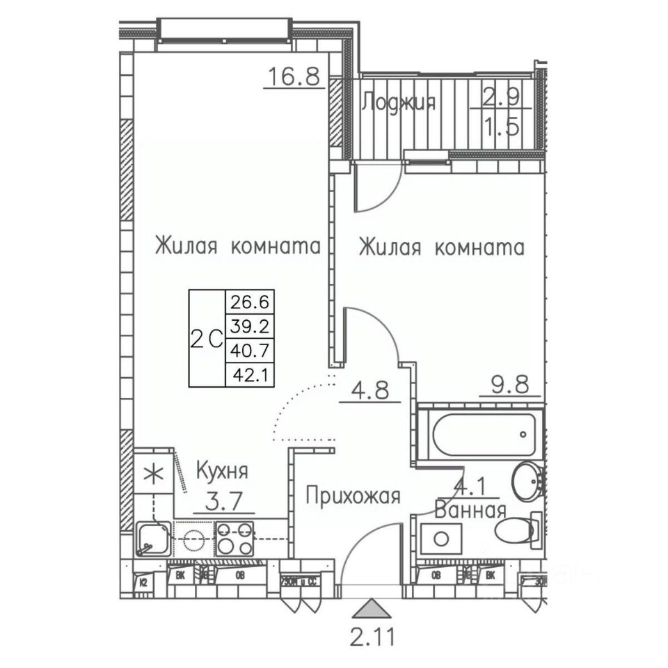 Общая площадь квартиры — 42.1 кв. м, этаж 12 из 19.