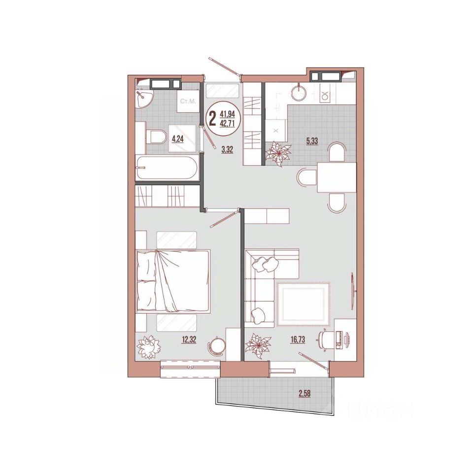 Продаётся 2-комнатная квартира в строящемся доме (Корпус 1), срок сдачи: III-кв. 2026, общей площадью 42.71 кв.м., на 10 этаже. Новый жилой дом от застройщика "СЗ Стоунлэнд" расположен по адресу: Россия, Приморский край, Владивосток, улица Адмирала Юмашева
