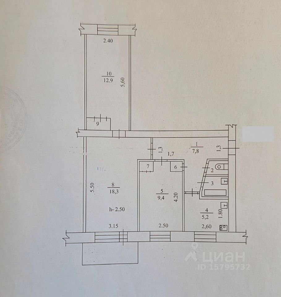 Квартира удобной планировки, общей площадью 57,7 кв.м. Жилая площадь 44,2 кв.м.: просторная гостиная 18,3 кв.м.; две раздельные комнаты 12,9 и 9,4 кв.м. Уютная кухня. Раздельный санузел. Удобная ниша для холодильника. Балкон не застеклен. Окна квартиры выходят на две стороны дома, что обеспечивает хорошее естественное освещение в течение дня.