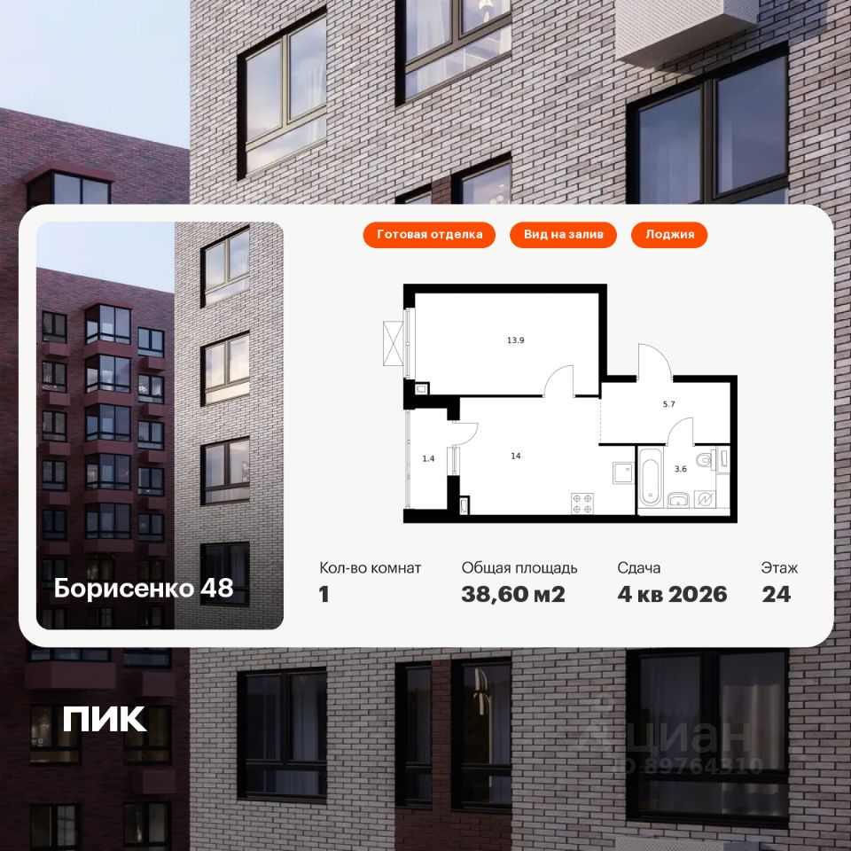 Продаётся 1-комн. квартира площадью 38,6 кв.м на 24 этаже 30 этажного дома (Корпус 4, Секция 4) проекта ПИК Борисенко 48. Светлый просторный подъезд на уровне земли, функциональная планировка, большие окна, c отделкой.