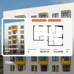 Продаётся 3-комн. квартира площадью 88,5 кв.м на 4 этаже 17 этажного дома (Корпус 5, Секция 1) проекта ПИК Босфорский парк. Светлый просторный подъезд на уровне земли, функциональная планировка, большие окна, предчистовая отделка.