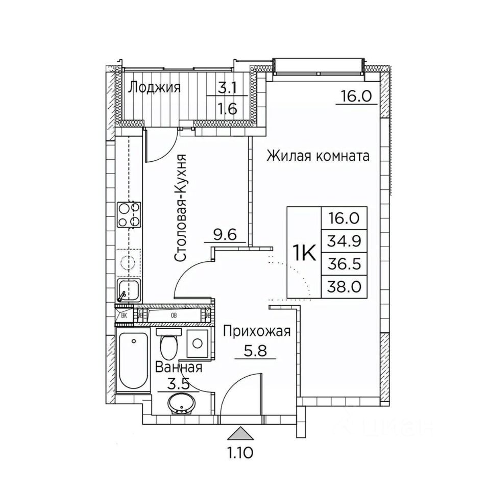 Площадь кухни9,6 м²