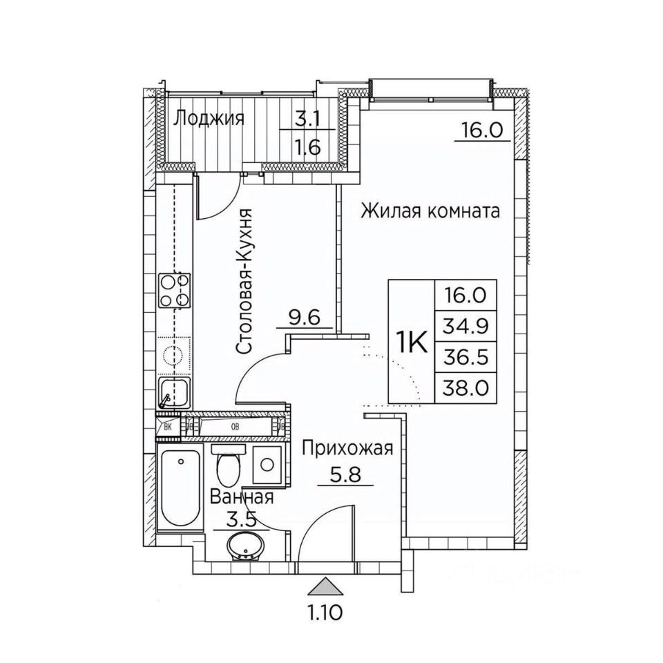Общая площадь квартиры — 38 кв. м, этаж 12 из 20.