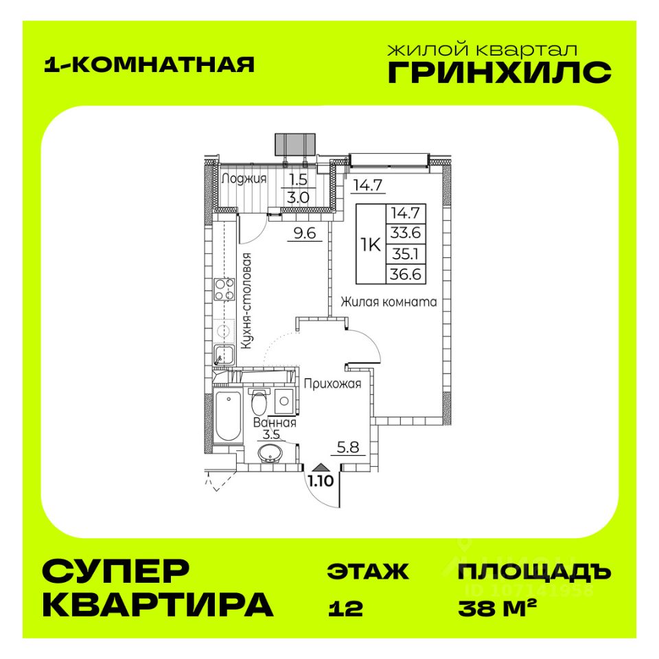 Продается 1-к квартира с отделкой под ключ в ЖК "Гринхилс".