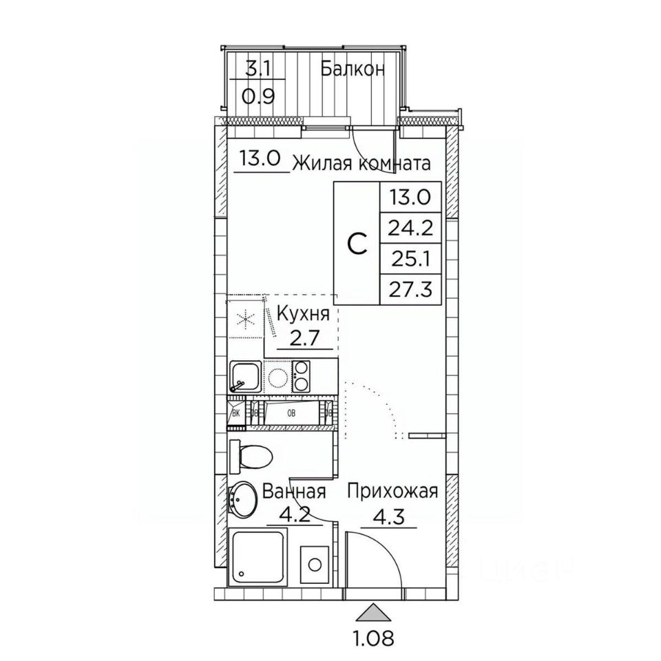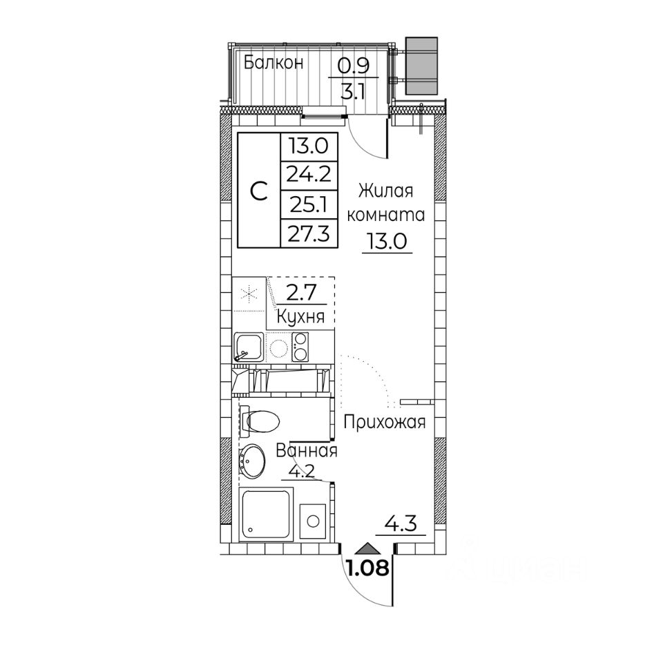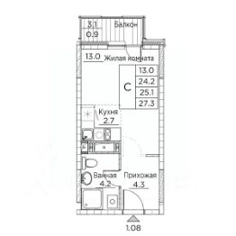 Общая площадь квартиры — 27.3 кв. м, этаж 13 из 20.
