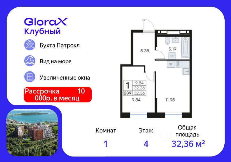 Продается 1-комн. квартира на 4-м этаже в квартале GloraX Клубный. GloraX Клубный - уникальный видовой проект с выделяющейся архитектурой в развитом районе Владивостока. Общая площадь лота составляет 32,36 кв. м, из которых 9,84 кв. м отведено под жилую и 11,95 кв. м под кухонную зону. Номер квартиры - 239.