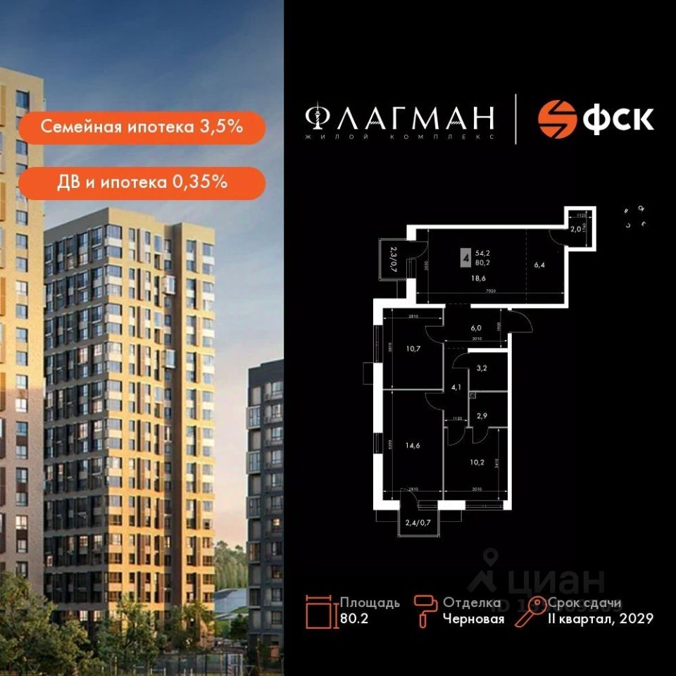 Продаётся 4-к квартира номер 276 общей площадью 80.2 кв.м. на 24-м этаже 30 этажного дома. Отделка Whitebox. Цена с учётом скидки!