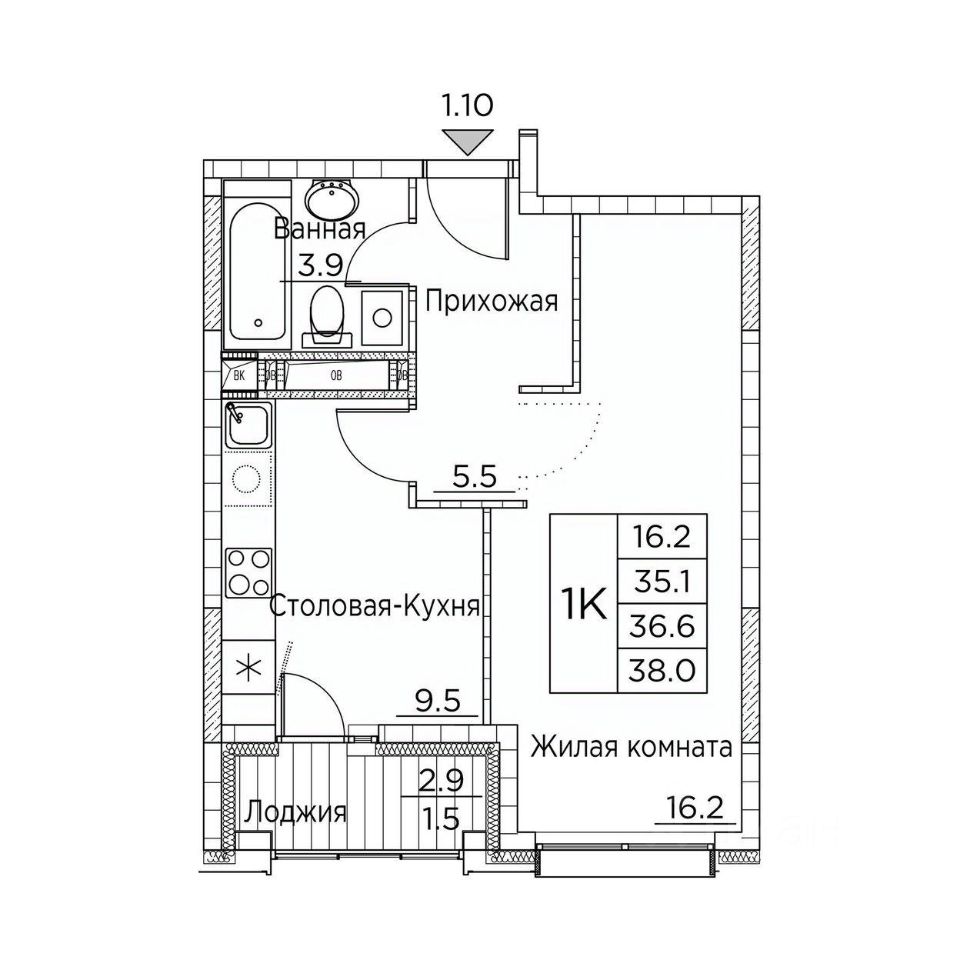 Общая площадь38 м²