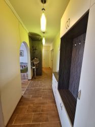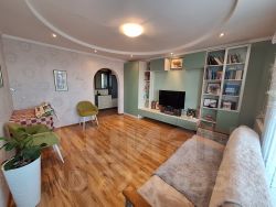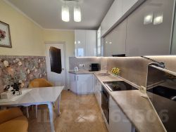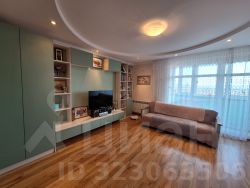Сделан свежий ремонт, установлена новая мебель на заказ. В гостиной панорамное окно. Поклеены обои под покраску, полы — ламинат и плитка, в одной из комнат — тёплый пол. Пластиковые окна, раздельный санузел в кафеле. Потолки — натяжные и побелка. Застеклённая лоджия, входная железная дверь.