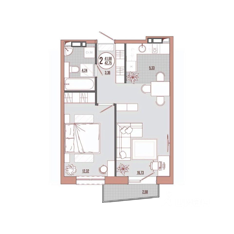 Продаётся 2-комнатная квартира в строящемся доме (Корпус 1), срок сдачи: III-кв. 2026, общей площадью 42.75 кв.м., на 7 этаже. Новый жилой дом от застройщика "СЗ Стоунлэнд" расположен по адресу: Россия, Приморский край, Владивосток, улица Адмирала Юмашева