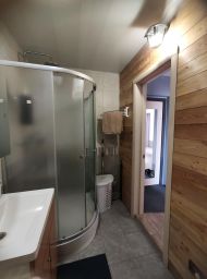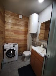 Совмещенный санузел вмещает в себя все необходимое: душевая кабина, раковина, зеркальный шкаф, бойлер, стиральная машина, теплый пол.