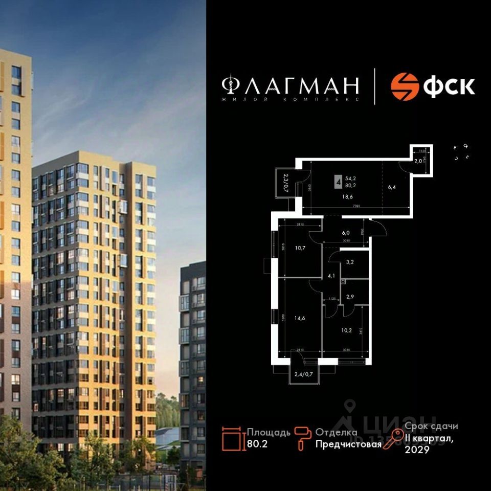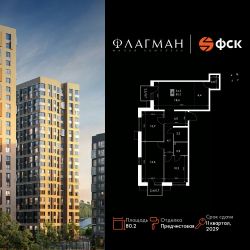 Продаётся 4-к квартира номер 60 общей площадью 80.2 кв.м. на 6-м этаже 30 этажного здания. Отделка Whitebox. Цена с учётом скидки.