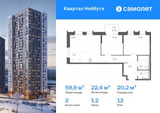 Строим кварталы для жизни с заботой о будущем. Предлагается 2-комнатная квартира комфорт-класса 59,93 кв.м в корпусе 1.2 на 12 этаже, в ЖК "Квартал Нейбута"