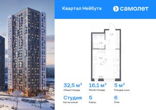 Строим кварталы для жизни с заботой о будущем. Предлагается квартира студия комфорт-класса 32,52 кв.м в корпусе 5 на 6 этаже, в ЖК "Квартал Нейбута"