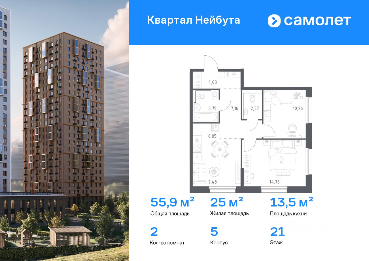 Строим кварталы для жизни с заботой о будущем. Предлагается 2-комнатная квартира комфорт-класса 55,94 кв.м в корпусе 5 на 21 этаже, в ЖК "Квартал Нейбута"