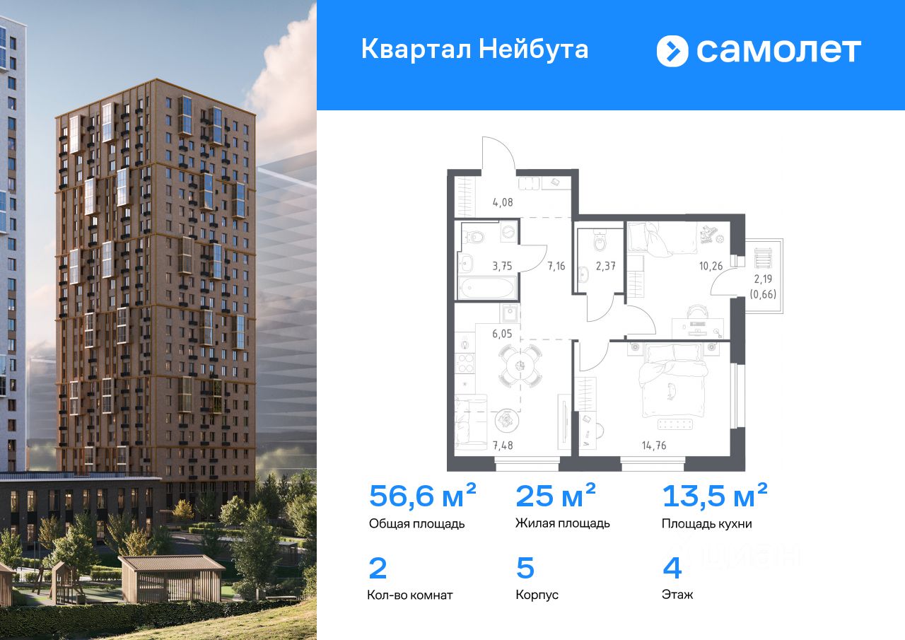 Строим кварталы для жизни с заботой о будущем. Предлагается 2-комнатная квартира комфорт-класса 56,57 кв.м в корпусе 5 на 4 этаже, в ЖК "Квартал Нейбута"