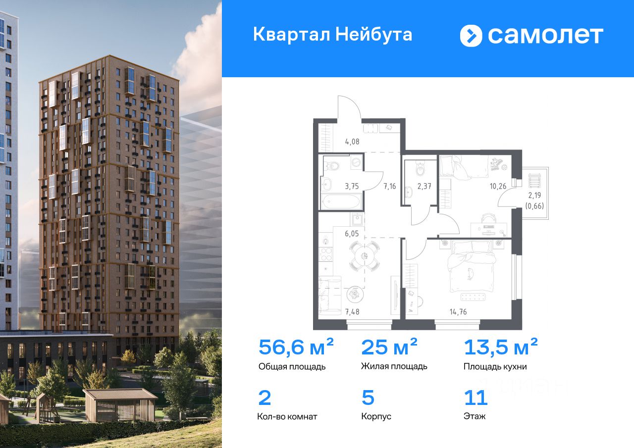Строим кварталы для жизни с заботой о будущем. Предлагается 2-комнатная квартира комфорт-класса 56,57 кв.м в корпусе 5 на 11 этаже, в ЖК "Квартал Нейбута"