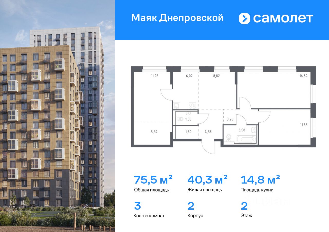 Строим кварталы для жизни с заботой о будущем. Предлагается 3-комнатная квартира комфорт-класса 75,49 кв.м в корпусе 2 на 2 этаже, в ЖК "Маяк Днепровской"