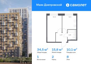 Строим кварталы для жизни с заботой о будущем. Предлагается 1-комнатная квартира комфорт-класса 34,54 кв.м в корпусе 2 на 8 этаже, в ЖК "Маяк Днепровской"