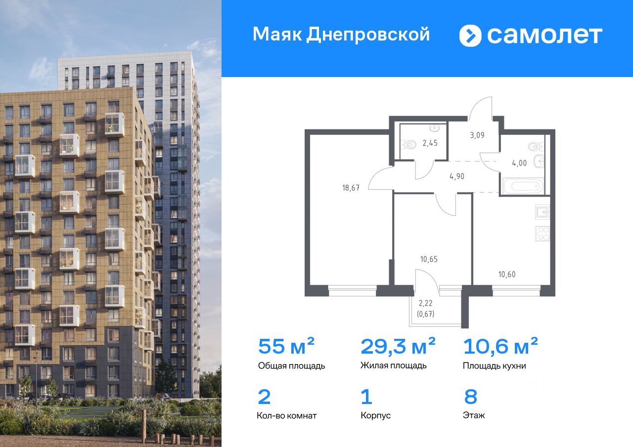Строим кварталы для жизни с заботой о будущем. Предлагается 2-комнатная квартира комфорт-класса 55,03 кв.м в корпусе 1 на 8 этаже, в ЖК "Маяк Днепровской"