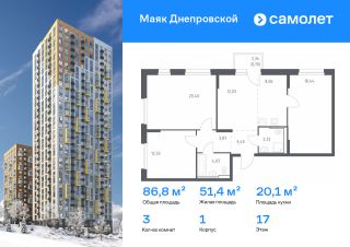 Строим кварталы для жизни с заботой о будущем. Предлагается 3-комнатная квартира комфорт-класса 86,79 кв.м в корпусе 1 на 17 этаже, в ЖК "Маяк Днепровской"