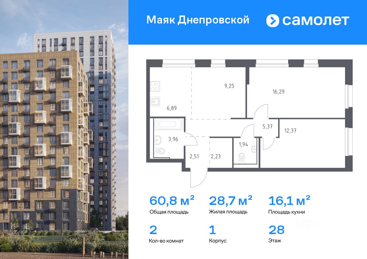 Строим кварталы для жизни с заботой о будущем. Предлагается 2-комнатная квартира комфорт-класса 60,81 кв.м в корпусе 1 на 28 этаже, в ЖК "Маяк Днепровской"