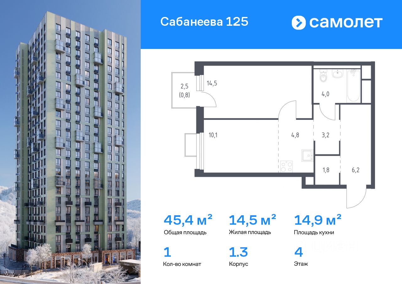 Строим кварталы для жизни с заботой о будущем. Предлагается 1-комнатная квартира комфорт-класса 45,4 кв.м в корпусе 1.3 на 4 этаже, в ЖК "Сабанеева 125"