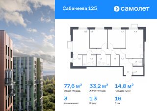 Строим кварталы для жизни с заботой о будущем. Предлагается 3-комнатная квартира комфорт-класса 77,6 кв.м в корпусе 1.3 на 16 этаже, в ЖК "Сабанеева 125"