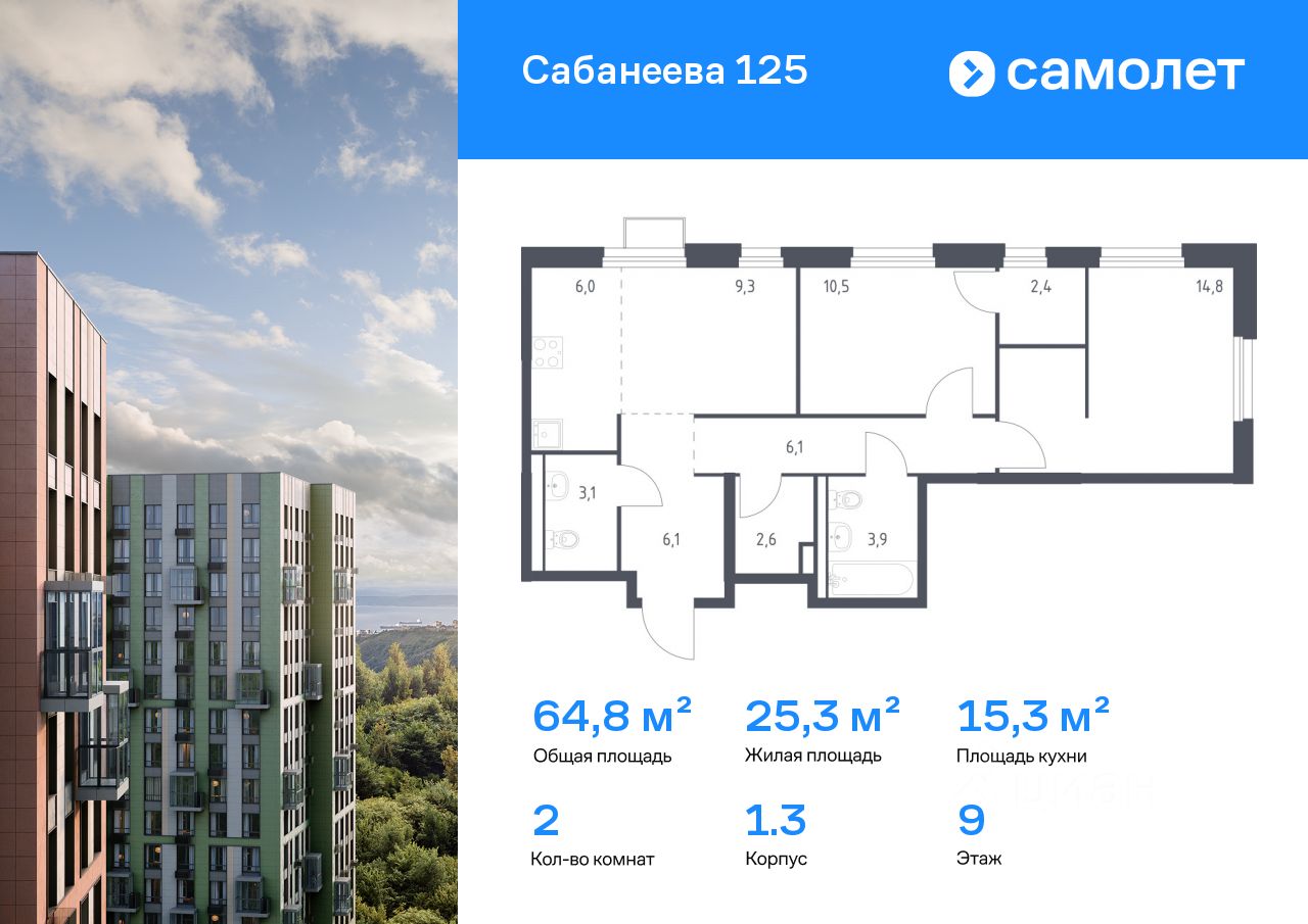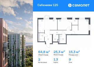 Строим кварталы для жизни с заботой о будущем. Предлагается 2-комнатная квартира комфорт-класса 64,8 кв.м в корпусе 1.3 на 9 этаже, в ЖК "Сабанеева 125"