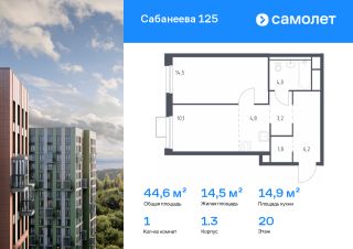 Строим кварталы для жизни с заботой о будущем. Предлагается 1-комнатная квартира комфорт-класса 44,6 кв.м в корпусе 1.3 на 20 этаже, в ЖК "Сабанеева 125"