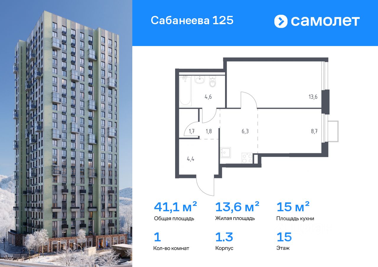 Строим кварталы для жизни с заботой о будущем. Предлагается 1-комнатная квартира комфорт-класса 41,1 кв.м в корпусе 1.3 на 15 этаже, в ЖК "Сабанеева 125"