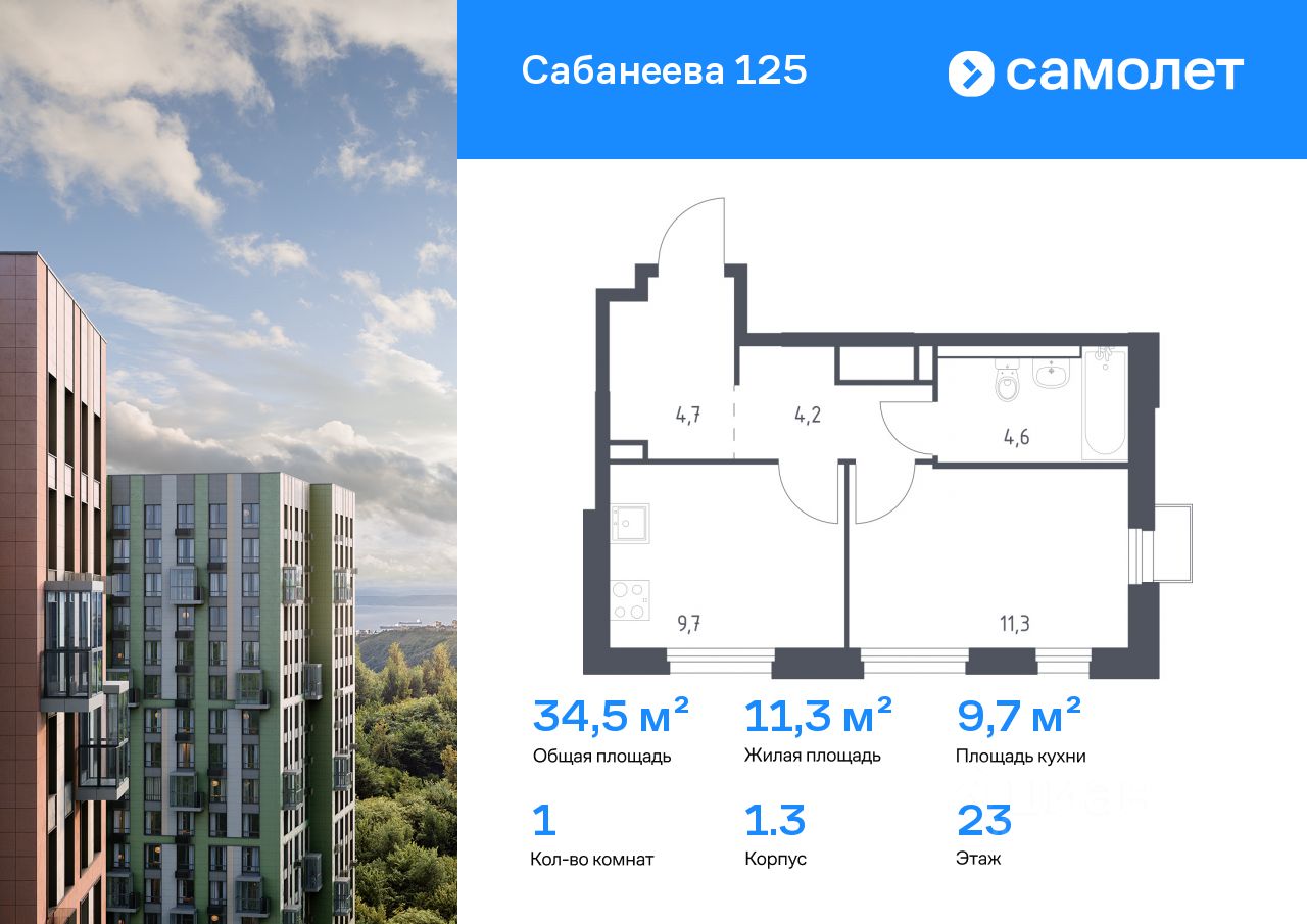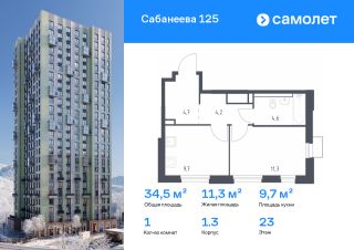 Строим кварталы для жизни с заботой о будущем. Предлагается 1-комнатная квартира комфорт-класса 34,5 кв.м в корпусе 1.3 на 23 этаже, в ЖК "Сабанеева 125"