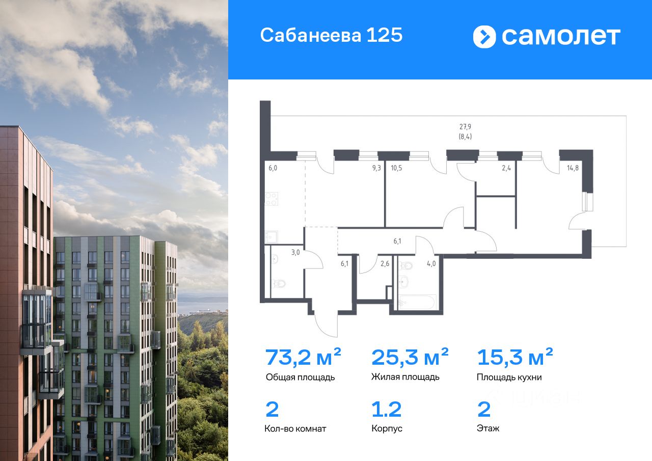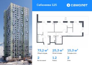 Строим кварталы для жизни с заботой о будущем. Предлагается 2-комнатная квартира комфорт-класса 73,2 кв.м в корпусе 1.2 на 2 этаже, в ЖК "Сабанеева 125"