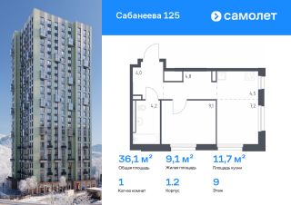 Строим кварталы для жизни с заботой о будущем. Предлагается 1-комнатная квартира комфорт-класса 36,1 кв.м в корпусе 1.2 на 9 этаже, в ЖК "Сабанеева 125"