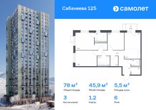 Строим кварталы для жизни с заботой о будущем. Предлагается 3-комнатная квартира комфорт-класса 78 кв.м в корпусе 1.2 на 6 этаже, в ЖК "Сабанеева 125"